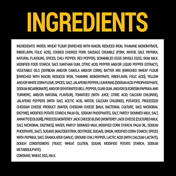 chili pepper, red pepper), Scrambled eggs (whole eggs, skim milk, modified food starch, salt, xanthan